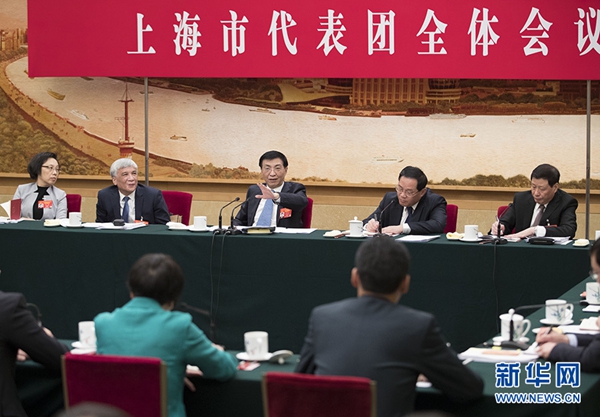 3月7日,中共中央政治局常委、中央书记处书记王沪宁参加十三届全国人大二次会议上海代表团的审议。 新华社记者 王晔 摄