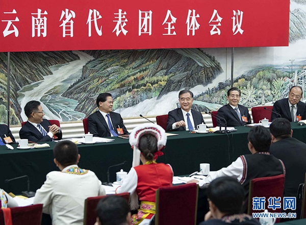 3月7日,中共中央政治局常委、全国政协主席汪洋参加十三届全国人大二次会议云南代表团的审议。 新华社记者 李涛 摄