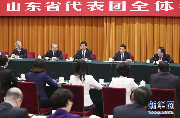 栗战书在山东代表团参加审议。在认真听取刘家义、龚正、郭锐等代表发言后,栗战书说,中国特色社会主义进入新时代,要更加自觉地维护习近平总书记党中央的核心、全党的核心地位,维护党中央权威和集中统一领导,以习近平新时代中国特色社会主义思想领航定向、凝心聚力,指导和推进各项工作。希望山东认真学习贯彻习近平总书记对山东工作的重要指示要求,贯彻新发展理念,探索以生态优先、绿色发展为导向的高质量发展新路子,推动经济发展质量变革、效率变革、动力变革。把打好脱贫攻坚战与实施乡村振兴战略有机衔接起来,打造乡村振兴的齐鲁样板。繁荣发展文化事业,大力弘扬沂蒙精神,为新时代改革发展提供强大精神动力,努力实现习近平总书记提出的“走在前列、全面开创”的殷切期望。
