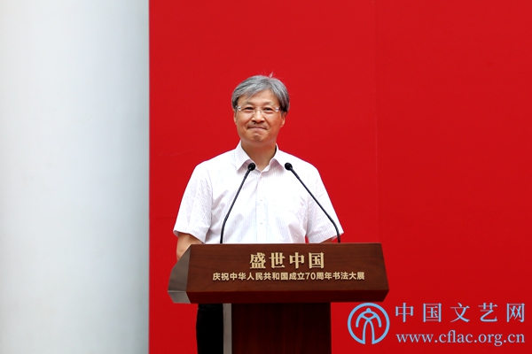 9月25日,“盛世中国——庆祝中华人民共和国成立70周年书法大展”开幕式在中国人民革命军事博物馆举行。图为中国文联党组书记、副主席李屹在开幕式上致辞。中国文艺网 张钰童 摄