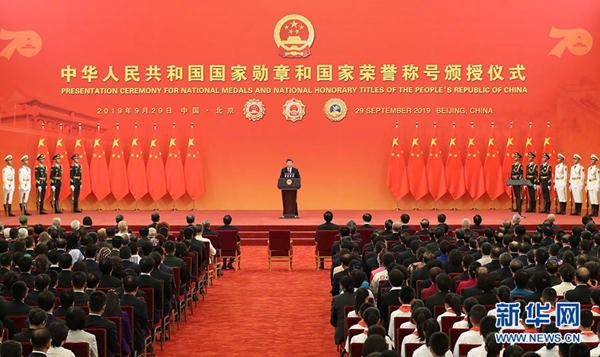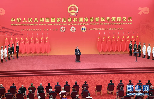 9月29日,中华人民共和国国家勋章和国家荣誉称号颁授仪式在北京人民大会堂金色大厅隆重举行。中共中央总书记、国家主席、中央军委主席习近平向国家勋章和国家荣誉称号获得者颁授勋章奖章并发表重要讲话。 新华社记者 黄敬文 摄