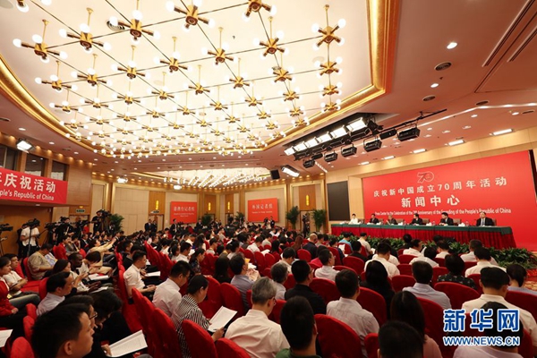 9月26日,庆祝中华人民共和国成立70周年活动新闻中心在北京梅地亚中心二层新闻发布厅举办第二场新闻发布会。图为新闻发布会现场。新华网记者郭小天摄