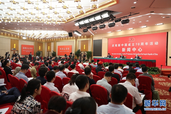 9月27日,庆祝中华人民共和国成立70周年活动新闻中心在梅地亚中心二层新闻发布厅举办第三场新闻发布会,中央农村工作领导小组办公室主任、农业农村部部长韩长赋,国务院扶贫开发领导小组办公室主任刘永富介绍全面建成小康社会,扎实推进脱贫攻坚和乡村振兴,并回答记者提问。图为发布会现场。新华网陈杰摄