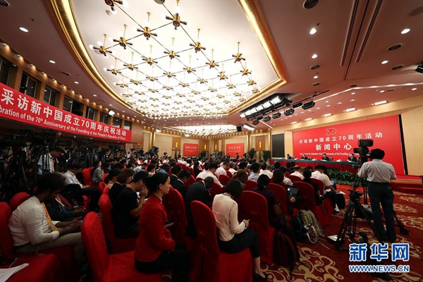 9月29日,庆祝中华人民共和国成立70周年活动新闻中心在北京梅地亚中心二层新闻发布厅举办第四场新闻发布会。图为新闻发布会现场。新华网记者焦鹏摄