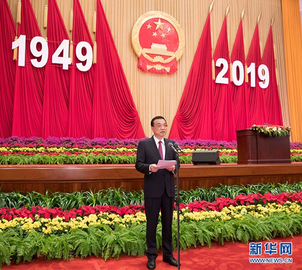 9月30日晚,庆祝中华人民共和国成立70周年招待会在北京人民大会堂隆重举行。中共中央政治局常委、国务院总理李克强主持招待会。 新华社记者 黄敬文 摄