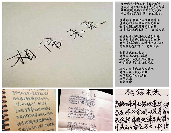 或许,这所有的一切已经在当年食指“用孩子的笔体写下:相信未来”时,被预言到了,在诗歌的后半部分,食指写道: