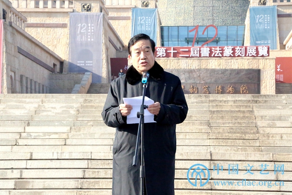 12月10日,全国第十二届书法篆刻展览行书草书展在陕西宝鸡开幕,图为中国文联党组成员、副主席陈建文在开幕式上讲话并宣布展览开幕。中国文艺网 高森摄
