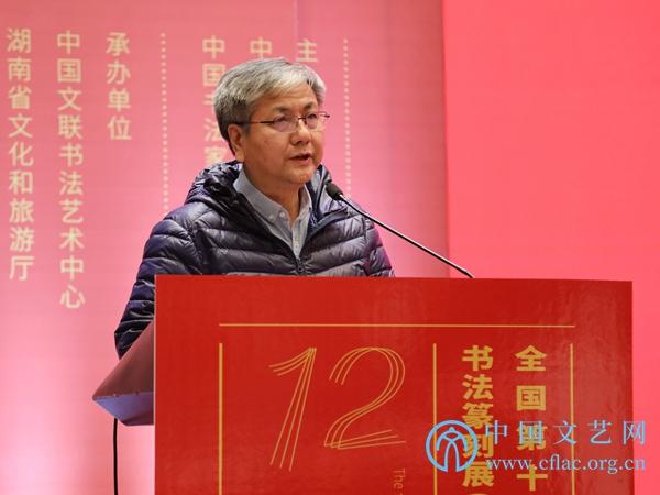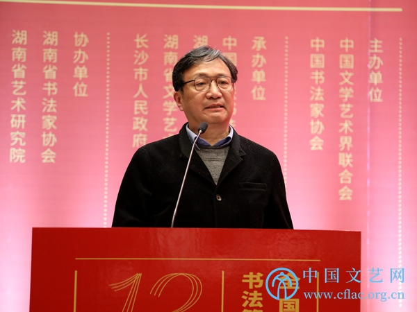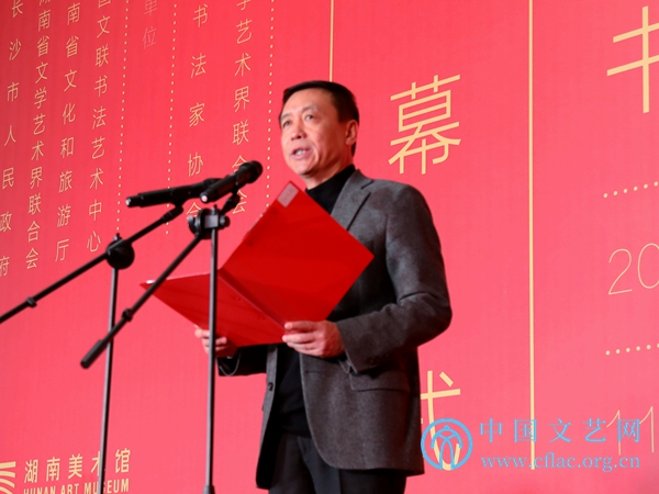 11月26日,全国第十二届书法篆刻展览楷书隶书展开幕式在湖南美术馆举行,图为中国书协分党组书记、驻会副主席陈洪武主持开幕式。中国文艺网 韩雪竹摄