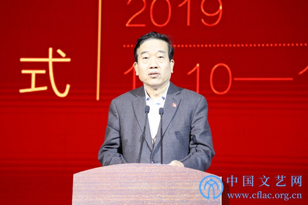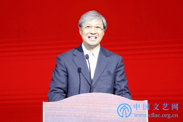 11月10日,全国第十二届书法篆刻展览篆书篆刻刻字展在山东济南开幕。图为山东省文联党组书记、副主席王世农致欢迎词。 中国文艺网 韩雪竹 摄