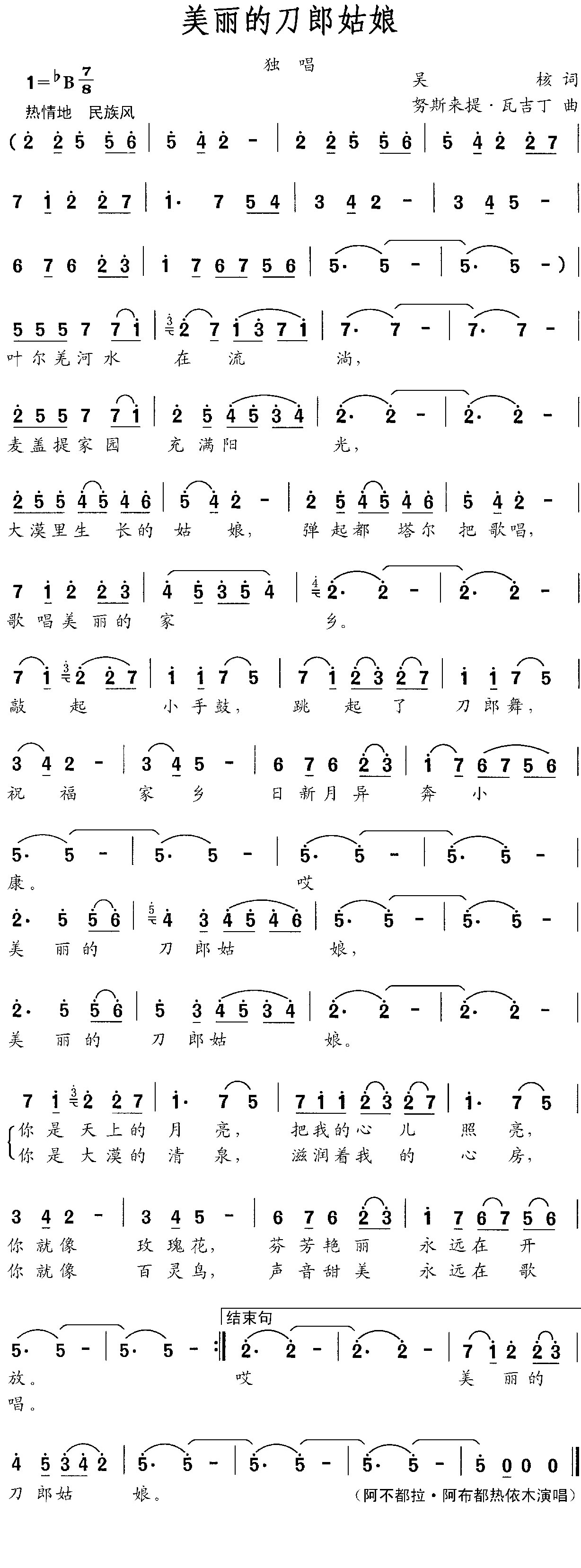 刀郎文化作为新疆大漠文化的一部分,有着鲜明的地域特色,歌曲《美丽的刀郎姑娘》巧妙地用音乐来捕捉、渲染刀郎文化所特有的艺术色彩,具有很强的感染力。旋律创作采用了八七拍子,律动流畅、节奏动感。歌曲描绘了开放、包容、快乐、美丽的刀郎姑娘形象,表达了人们心中洋溢的幸福之感,歌颂了塔里木河流域各民族同胞共同努力建设家园,用汗水浇灌团结之花,用真情培育幸福之花的美好景象。