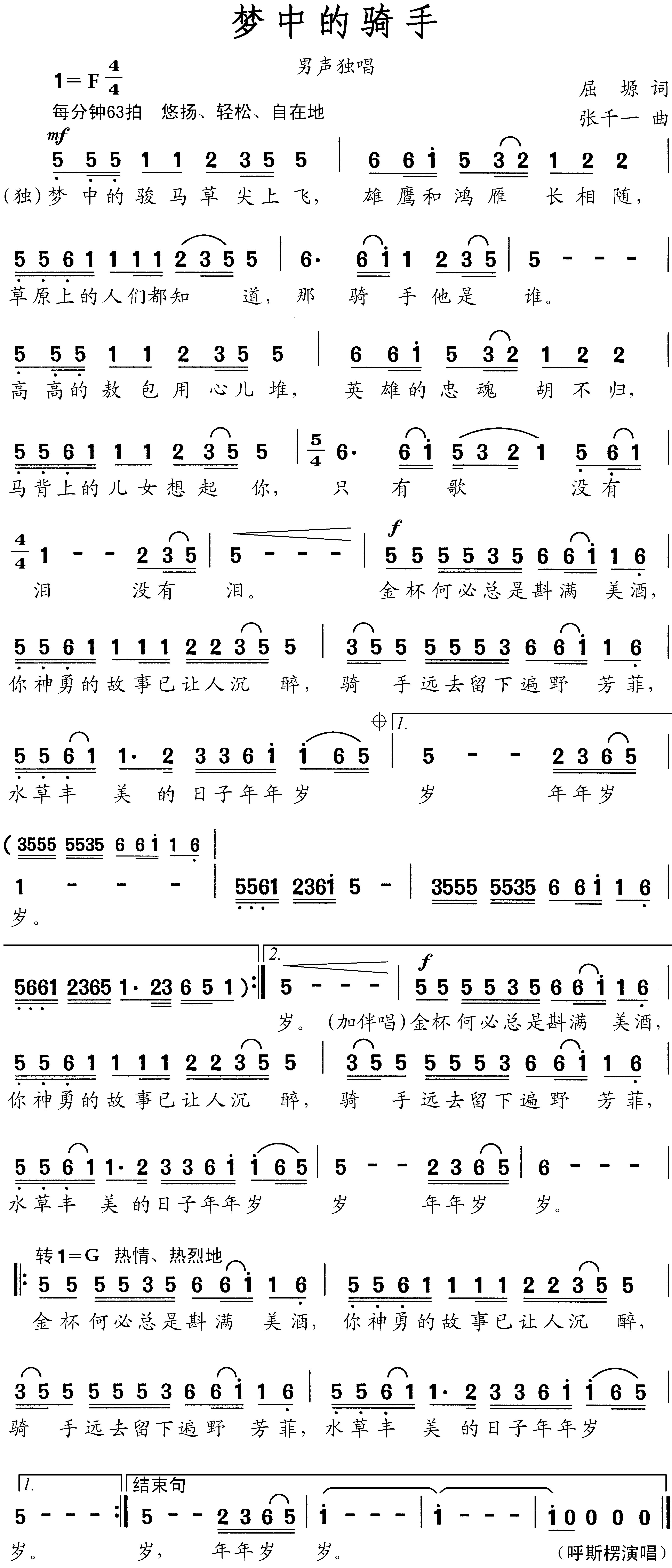 草原上的民族是英雄的民族,牧人的身上流淌着英雄的热血,英雄的故事在草原上经久不息地传诵着。《梦中的骑手》是一曲英雄的颂歌,有别于常见的草原歌曲,作曲家采用好来宝这种蒙古曲艺样式的别致元素,在乐队中加入四胡、霍布斯等民族特色乐器,作品充满浓郁的民族风情,激越、遒劲的曲风让人耳目一新,是一首颇具感染力的原创作品。