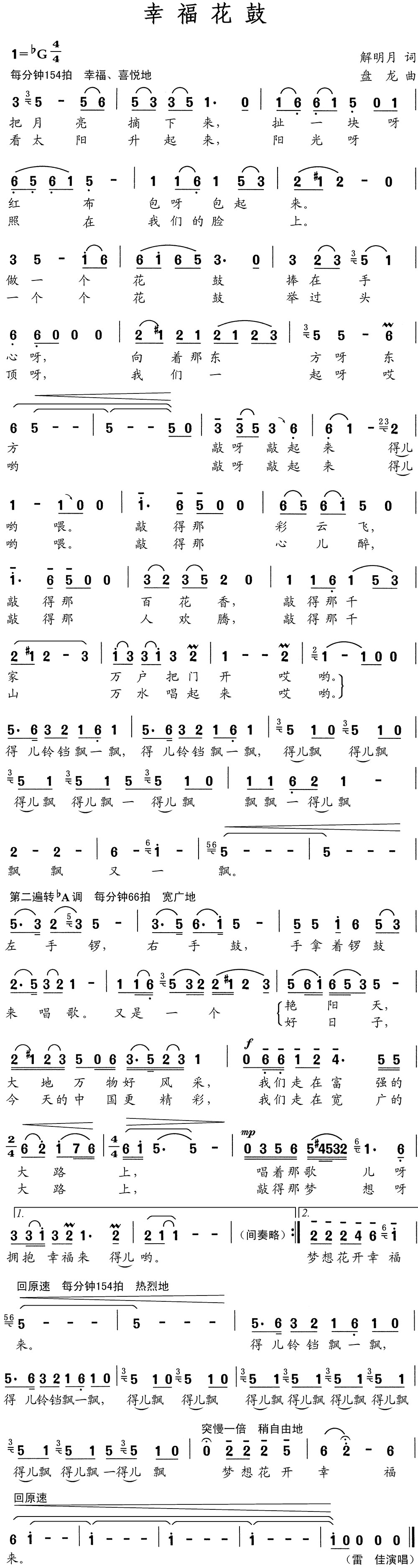 歌曲以安徽民歌《凤阳花鼓》之“花鼓”二字为切入点展开,旋律汲取原民歌中“左手锣、右手鼓”和“得儿飘得儿飘一得儿飘”的音乐元素并有机结合,赋予了一个崭新的、充满幸福的“花鼓”并以此来赞美新时代中国人民的美好生活。