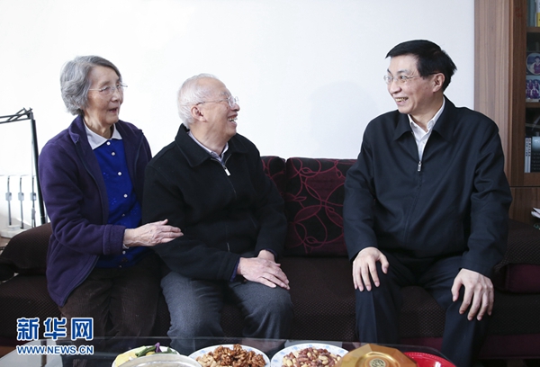 2月13日上午,中共中央政治局常委、中央书记处书记王沪宁代表习近平总书记和党中央在北京看望文化界知名人士和科技专家,向他们致以诚挚问候,向广大文化工作者和科技工作者致以新春祝福。这是王沪宁看望著名男高音歌唱家吴雁泽。新华社记者 刘卫兵 摄
