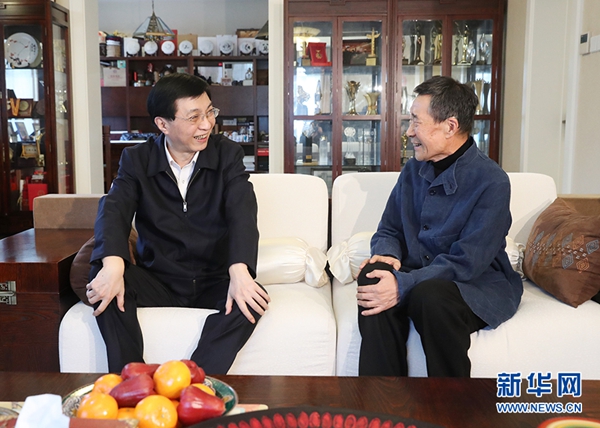 1月22日,中共中央政治局常委、中央书记处书记王沪宁代表习近平总书记和党中央看望文化教育界知名人士和科技专家,向他们致以诚挚问候,向广大文化教育工作者和科技工作者致以新春祝福。这是王沪宁看望著名电影表演艺术家李雪健。 新华社记者 姚大伟 摄