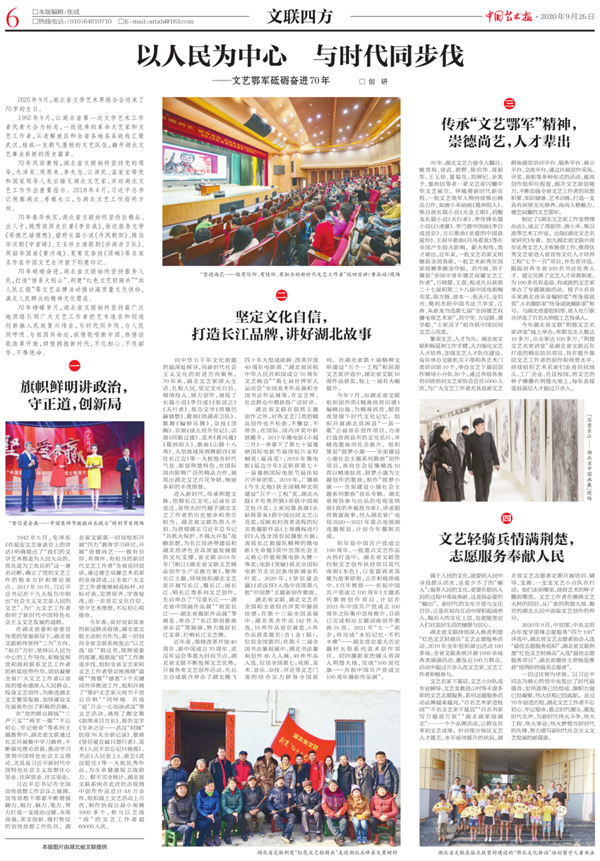 《中国艺术报》发布《以人民为中心 与时代同步伐 ——文艺鄂军砥砺奋进70年》报纸专版,通过“旗帜鲜明讲政治,守正道,创新局”“坚定文化自信,打造长江品牌,讲好湖北故事”“传承‘文艺鄂军’精神,崇德尚艺,人才辈出”“文艺轻骑兵情满荆楚,志愿服务奉献人民”四个板块内容回顾湖北省文联70年来取得的成就。