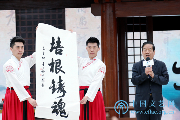 4月10日,在绍兴市第三十五届兰亭书法节开幕之际,“源流·时代——以王羲之为中心的历代法书与当前书法创作”(古代篇)之“尽得风流——王羲之的尺牍”与“荣擢百代——王羲之的谱系”正式对观众开放。图为中国书协主席苏士澍现场创作书法作品“培根铸魂”为书法节开笔。中国文艺网 韩雪竹摄
