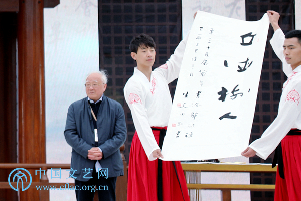 4月10日,在绍兴市第三十五届兰亭书法节开幕之际,“源流·时代——以王羲之为中心的历代法书与当前书法创作”(古代篇)之“尽得风流——王羲之的尺牍”与“荣擢百代——王羲之的谱系”正式对观众开放。图为中国书协主席苏士澍,中国书协顾问朱关田为书法节开笔。中国文艺网 韩雪竹摄
