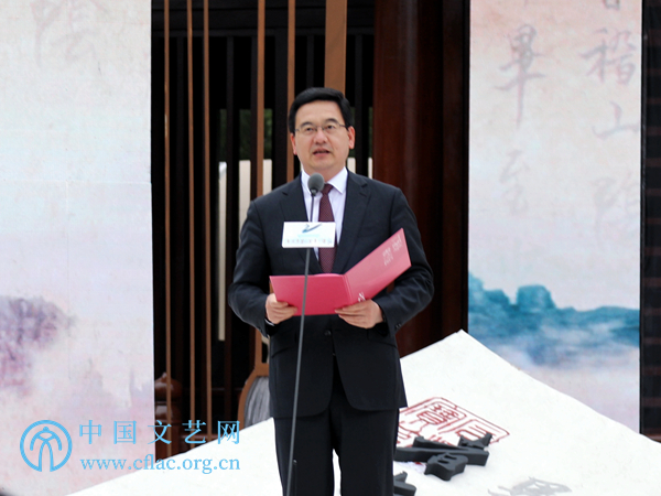 4月10日,在绍兴市第三十五届兰亭书法节开幕之际,“源流·时代——以王羲之为中心的历代法书与当前书法创作”(古代篇)之“尽得风流——王羲之的尺牍”与“荣擢百代——王羲之的谱系”正式对观众开放。图为绍兴市委副书记、市长盛阅春主持开幕式。中国文艺网 韩雪竹摄