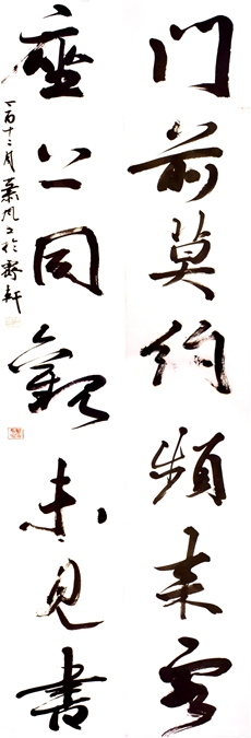 书法对联 (释文:门前莫约频来客,座上同观未见书。)