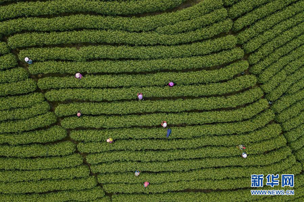 采茶工在浙江省安吉县溪龙乡黄杜村的茶山上采茶(2018年3月24日摄,无人机照片)。 新华社记者 黄宗治 摄