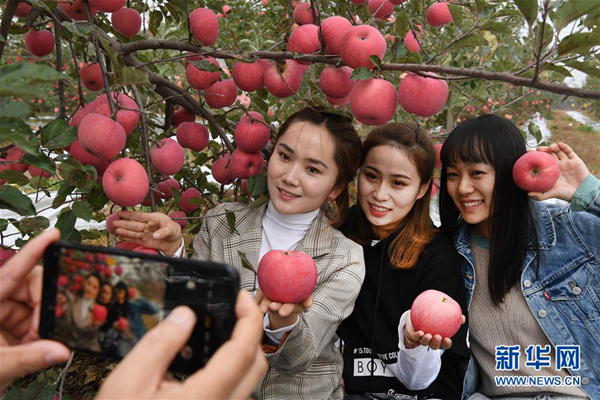 游客在陕西省延安市志丹县双河镇李家湾村果园拍照留影(2019年10月22日摄)。 新华社记者 陶明 摄