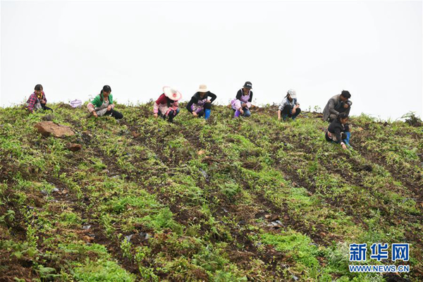 农民在贵州省普安县地瓜镇屯上村的“扶贫茶园”里给茶苗除草(2019年7月7日摄)。当地的茶园栽种有浙江安吉黄杜村捐赠的白茶苗。 新华社记者 杨文斌 摄