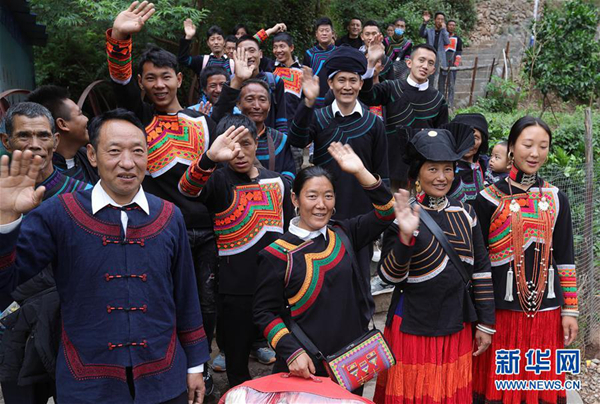 “悬崖村”搬新家的村民在山下公路边合影留念(5月12日摄)。 新华社记者 江宏景 摄