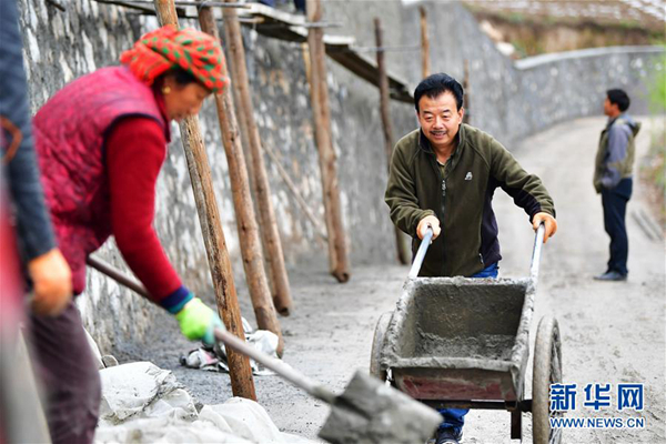 甘肃省甘南藏族自治州舟曲县果耶镇勒阿村驻村第一书记张金利(右)和村民一起修建入村道路的护坡(2020年4月22日摄)。 新华社记者 陈斌 摄