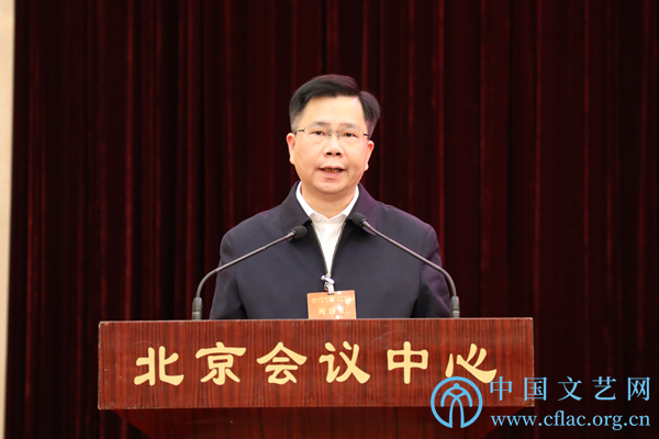 1月8日,中国文联十届五次全委会在京闭幕。图为厦门市文联党组书记、副主席林跃锋在中国文联十届五次全委会第二次全体会议上作交流发言。中国文艺网 李想摄