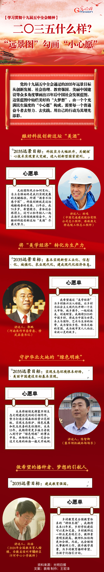 党的十九届五中全会通过的2035年远景目标从创新发展、社会治理、教育强国、美丽中国建设等众多角度擘画出15年后中国社会发展蓝图。这张蓝图中灿烂美好的“大梦想”,由一个个充满民生温度的“小心愿”构成,需要每一个普通奋斗者去努力、去实践,用自己的行动为其增光添彩。