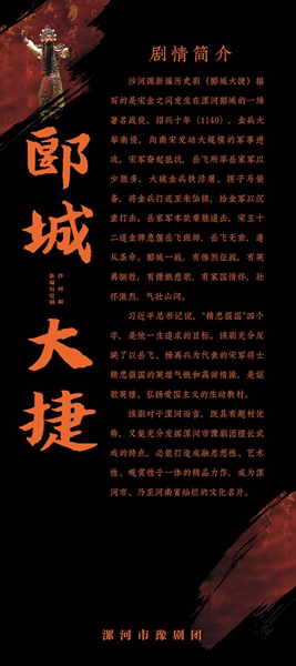 此剧描写了宋金之间发生在漯河郾城的一场著名战役。绍兴十年(1140),金兵大举南侵,向南宋发动大规模的军事进攻。宋军奋起抵抗,岳飞所率岳家军以少胜多,大破金兵铁浮屠、拐子马装备,将金兵打退至朱仙镇,给金军以沉重打击。岳家军本欲乘胜追击,宋王十二道金牌急催岳飞班师,岳飞无奈,遵从圣命。郾城一战,有惨烈征战,有英勇牺牲,有慷慨悲歌,有家国情怀,壮怀激烈,气壮山河。