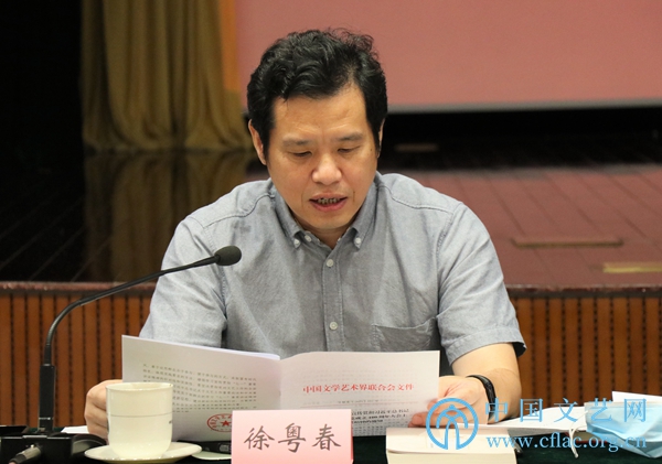 7月15日,“文艺评论界学习贯彻习近平总书记在庆祝中国共产党成立100周年大会上的重要讲话精神座谈会”在京召开。图为中国文艺评论家协会副主席兼秘书长、中国文联文艺评论中心主任徐粤春传达《中国文联关于学习宣传贯彻习近平总书记在庆祝中国共产党成立100周年大会上重要讲话精神的通知》。中国文艺网 包梦暄 摄