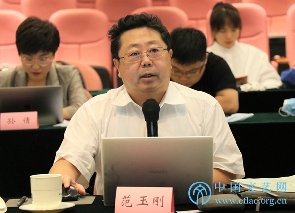 7月15日,“文艺评论界学习贯彻习近平总书记在庆祝中国共产党成立100周年大会上的重要讲话精神座谈会”在京召开。图为文艺评论家代表范玉刚发言。中国文艺网 包梦暄 摄