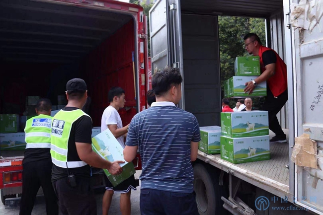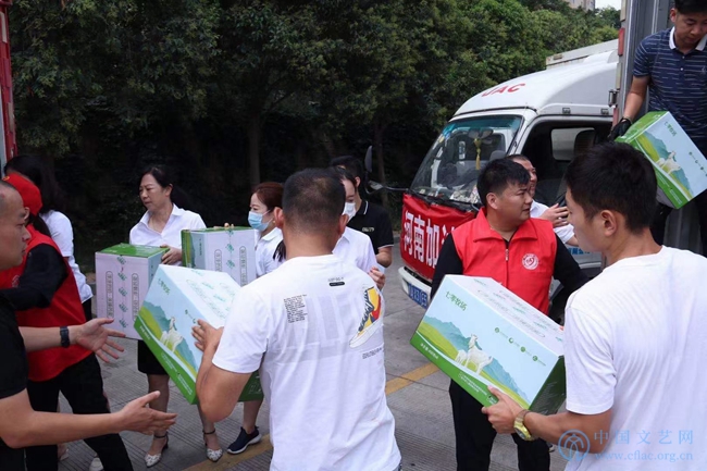 志愿者搬运送往河南暴雨灾区的物资(图片由中国曲艺家协会提供)