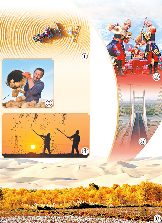图⑥:在二师三十三团,沙漠、胡杨、棉花等构成南疆一幅美丽画卷。
