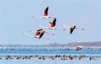 运城市盐湖生态环境持续好转,吸引了各种鸟类在此栖息。资料图片