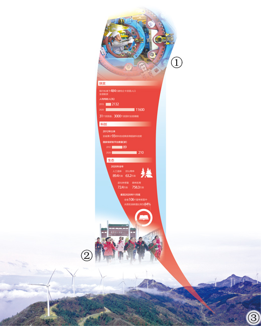 坚持以人民为中心的发展思想,奋力描绘共建共享的幸福生活新图景。推动“百万人”奔小康,484万建档立卡贫困人口全部脱贫、3000个贫困村全部出列、31个贫困县全部摘帽,做好巩固拓展脱贫攻坚成果同乡村振兴有效衔接。解决“千万人”兜底线,新冠疫情防控取得重大战略成果,持续多年推进33项民生工程,新增财力80%以上用于保障和改善民生。增强“所有人”幸福感,居民收入增长快于经济增长,连续9年进入全国平安建设先进行列。