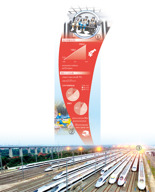 紧紧扭住发展第一要务,经济综合实力实现新跨越。从江西发展不足的基本省情出发,坚持用新发展理念引领发展行动,全面实施高质量跨越式发展首要战略,坚定不移提升质量、做大总量。大力实施创新驱动发展战略,扎实推进创新型省份建设,成功创建鄱阳湖国家自主创新示范区,中国科学院赣江创新研究院、中国工程科技发展战略江西研究院等重大创新平台落户江西,综合科技创新水平指数排位连续7年实现进位。全面实施产业链链长制,集中力量发展航空、电子信息、装备制造、中医药、新能源、新材料和现代农业等优势产业,大力推进数字经济“一号工程”,加快传统产业转型升级,构建了具有江西特色的现代产业体系。党的十八大以来,全省生产总值年均增长8.7%,总量达到2.57万亿元,在全国排位由第十九位前移至第十五位,三次产业结构比由11.7∶53.8∶34.5调整为8.7∶43.2∶48.1,发展的质量和效益不断提升。
