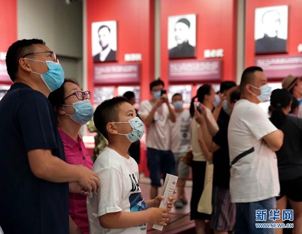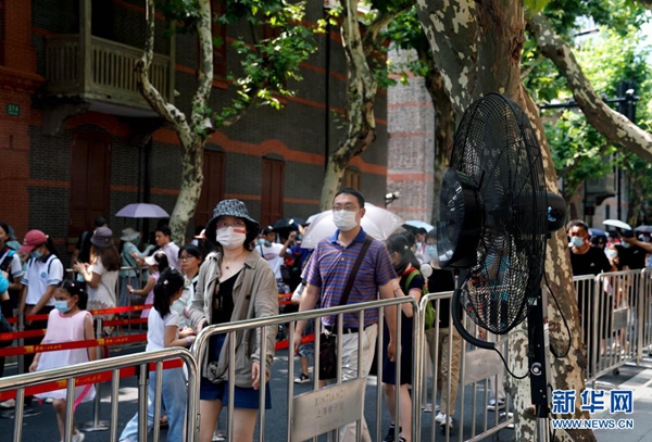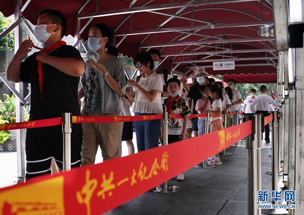 7月11日,观众在中共一大纪念馆前的遮阳棚下排队等待参观。