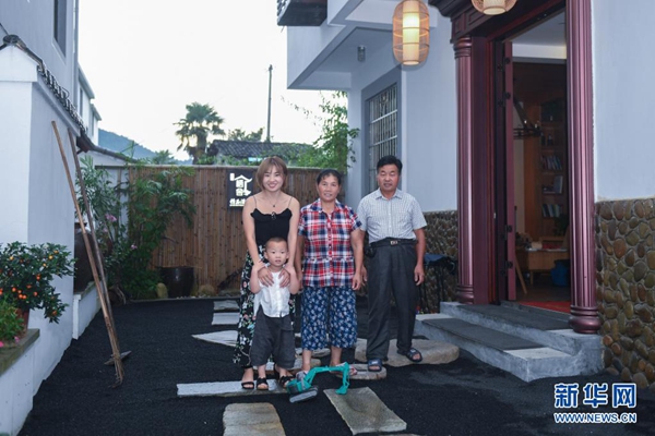 2017年8月9日,在浙江省淳安县枫树岭镇下姜村,村民姜丽娟(左一)与父亲姜北方(右一)、母亲王洋球(中)及儿子安安在自家开办的“栖舍”民宿院内合影。新华社记者 黄宗治 摄