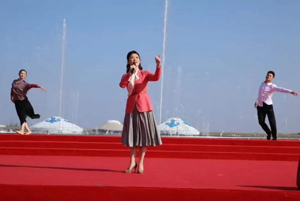 “我们的中国梦”——文化进万家中宣部、中国文联文艺志愿服务队走进内蒙古科右中旗主场慰问演出现场。图为吕薇演唱歌曲《多情的秋》(图片来源:科右中旗发布)