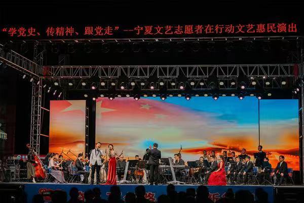 自治区文联将文艺志愿服务送文化、种文化、传精神的生动实践和中国共产党一脉相承的精神追求、精神特质、精神脉络紧密结合,精心组织举办了“学党史·传精神·跟党走”——宁夏文艺志愿者在行动文艺惠民演出暨乐漫光影《红色畅想》交响音乐会。分为《难忘的岁月》《神州巨变》《梦圆中国》等3个篇章,以百年党史为背景,紧紧围绕“学党史、强信念、跟党走”主题,在纵览中国共产党百年重要历史事件中串联起党的奋斗历程。