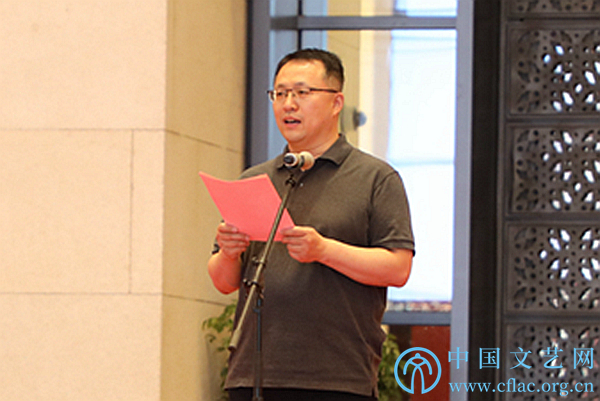 6月19日,“伟业:庆祝中国共产党成立100周年书法大展”在中国国家博物馆开幕。图为基层新文艺群体书家代表程志宏在开幕式上发言。 中国文艺网 李想 摄