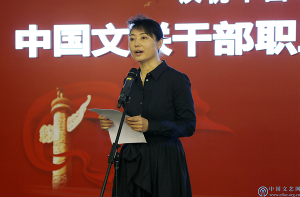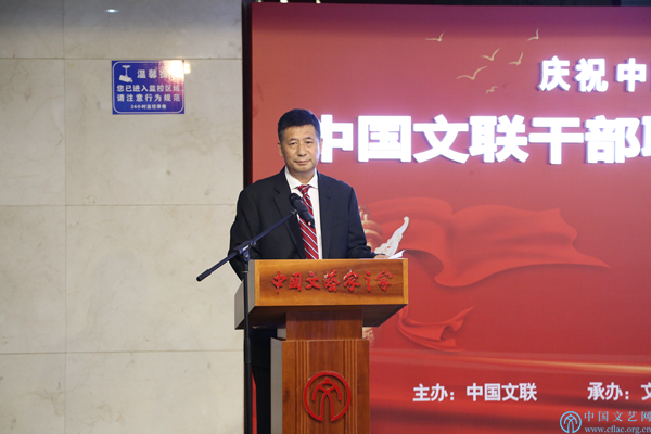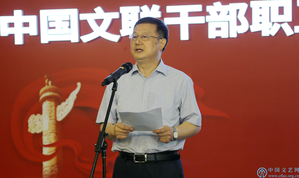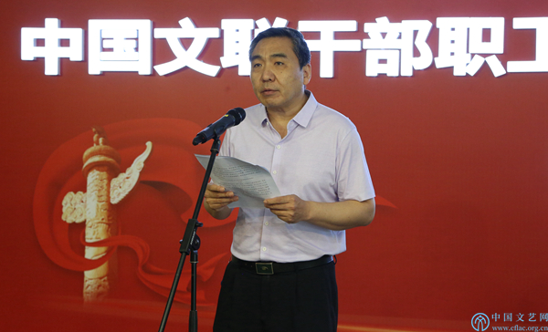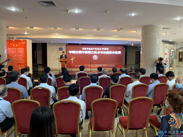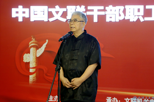 6月10日,由中国文联主办,中国文联机关党委、中国文联离退休干部局、中国文联机关工会联合会、中国文联机关团委承办的“庆祝中国共产党成立100周年 中国文联干部职工美术书法摄影作品展”在文艺家之家展览馆开幕。图为中国文联党组成员、副主席胡孝汉致辞。中国文艺网 王丽摄