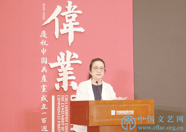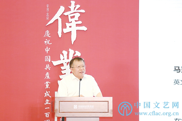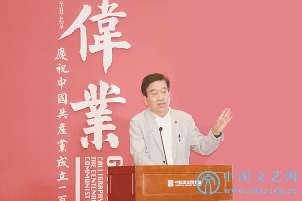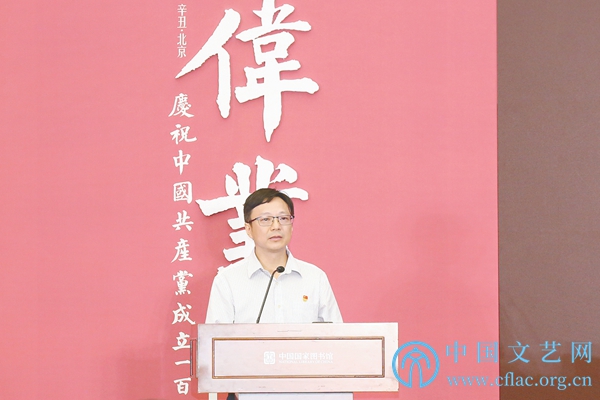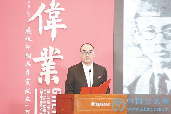 魏大威在致辞中表示,今年是中国共产党成立100周年,中国书协和中国国家图书馆等机构筹划举办“伟业:庆祝中国共产党成立100周年书法大展”,这是我们认真贯彻落实习近平总书记系列重要论述精神,深入开展党史学习教育,主动承担“举旗帜、聚民心、育新人、兴文化、展形象”使命任务的重要举措。大展中“崇高信仰”“光昭九域”两个篇章,特别展出中国国家图书馆珍藏的56件革命历史文献手稿,包括马克思、恩格斯、毛泽东等伟大领袖的亲笔书信等,并精选名篇名句,以现代书法艺术加以阐释,具有重要意义。我们期待不断推出记录新时代、书写新时代、讴歌新时代的精品典籍文化展览,持续为中华民族伟大复兴凝聚起磅礴的精神力量。