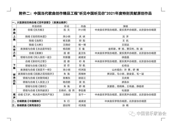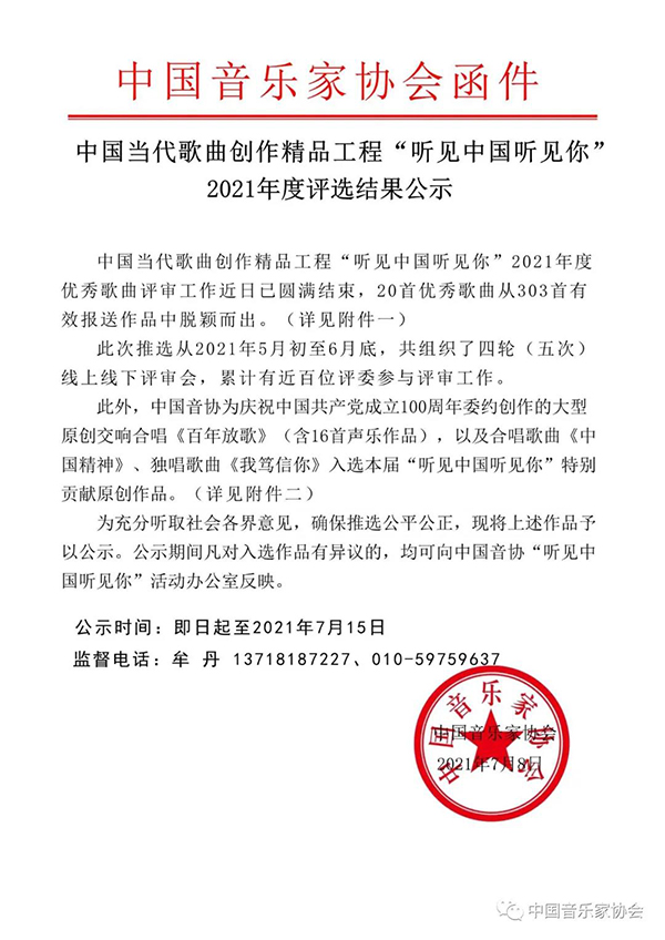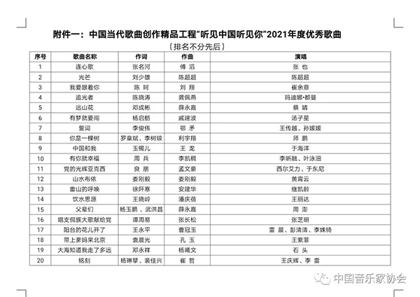 中国当代歌曲创作精品工程“听见中国听见你” 2021年度评选结果公示