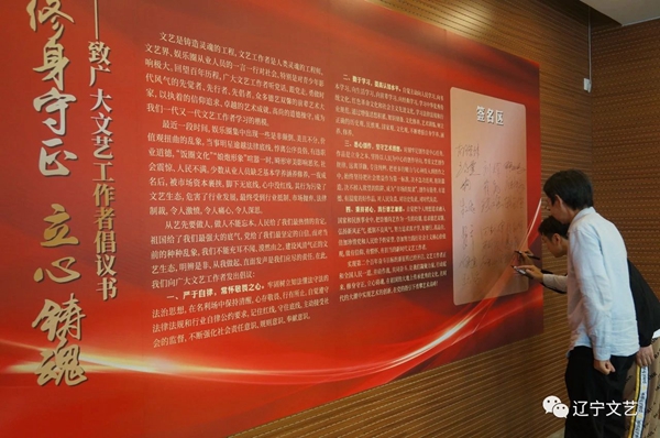 会议强调,辽宁文艺界要坚决抵制违法违规、失德失范等不良风气,大力弘扬新风正气,加强文艺工作者思想道德建设和行业引领。一是以文载道,自觉承担立心铸魂的职责使命。全省广大文艺家和文艺工作者要树立高远的人生追求和深厚的家国情怀,坚持以人民为中心的创作导向,把个人的艺术理想融入党和人民的伟大事业之中,把培育和弘扬社会主义核心价值观作为根本任务,推出更多讴歌党、讴歌祖国、讴歌人民、讴歌英雄的精品力作,自觉承担起为国家立心、为时代铸魂的职责使命。二是崇德尚艺,自觉坚持德艺双馨的理想追求。全省广大文艺家和文艺工作者要自觉践行社会主义核心价值观和“爱国、为民、崇德、尚艺”的文艺界核心价值观,努力提高学养、涵养、修养,追求真才学、好艺德、高品位;要辨是非、守底线、遵法纪,讲品位、讲格调、讲责任,自尊自爱、自律自重,弘扬主旋律,唱响正气歌,坚持立德修身,追求德艺双馨,做有信仰、有情怀、有担当的新时代文艺工作者。三是引领风尚,自觉坚守社会表率的责任担当。全省广大文艺家和文艺工作者要传承中华优秀传统文化,做忠实践行先进文化的表率;要勇于向炫富竞奢说不,成为时代风气的先觉者、先行者、先倡者,做积极引领社会风尚的表率;要树立正确的义利观,处理好社会主义市场经济条件下的义利关系,用独到深刻的思想、润物无声的艺术熏陶启迪人的心灵,做坚定守护人民心灵的表率。