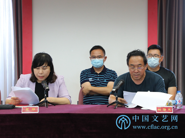 8月25日,“守正创新 聚焦时代——摄影界职业道德和行风建设工作座谈会”在京召开。图为解海龙、贾婷宣读《修身守正 立心铸魂——致广大文艺工作者倡议书》。中国文艺网 贾岩 摄