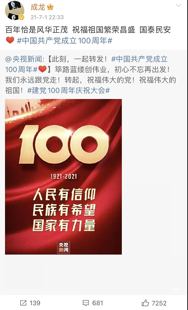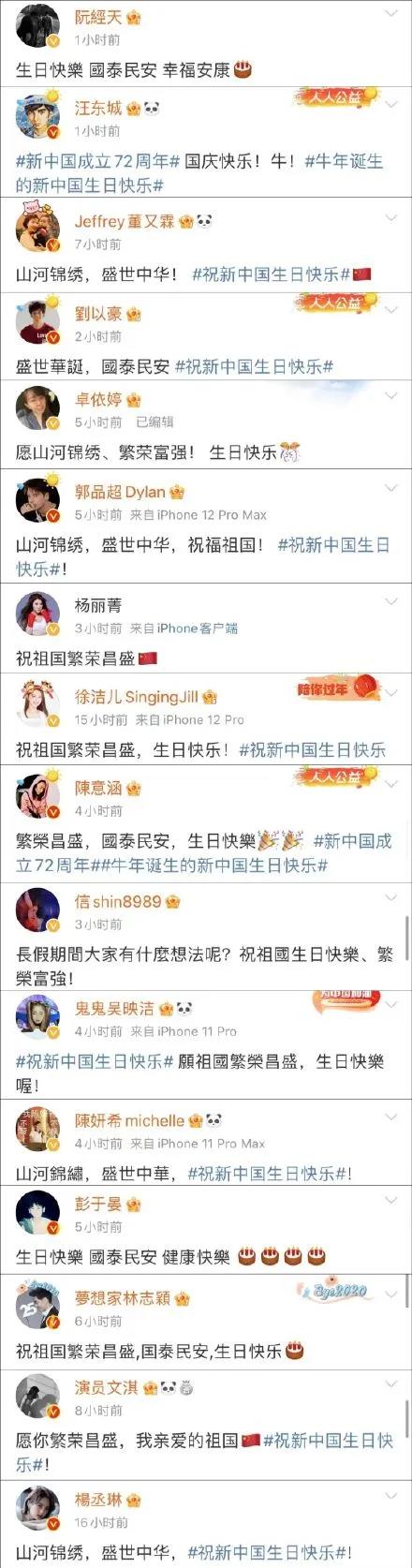 2021年国庆节期间,众多港澳台艺人在社交平台发出了自己对祖国母亲的祝福。“山河锦绣,盛世中华!”“愿你繁荣昌盛,我亲爱的祖国!”……这些真诚而炙热的文字,这些身为中国人的骄傲与自豪之情,令人感动,引人共鸣。