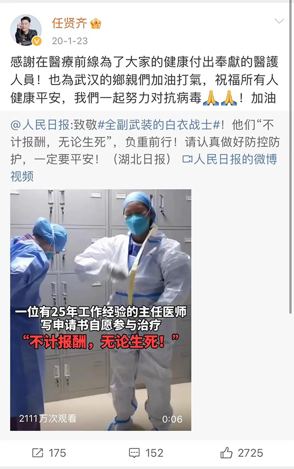 祖籍湖北武汉的台湾艺人任贤齐说:“感谢在医疗前线为了大家的健康付出奉献的医护人员!致敬!也为武汉的乡亲们加油打气,祝福所有人健康平安,我们一起努力对抗病毒,早日战胜疫情。武汉加油!医护人员加油!中国加油!”